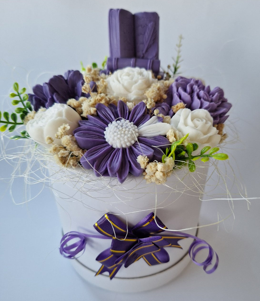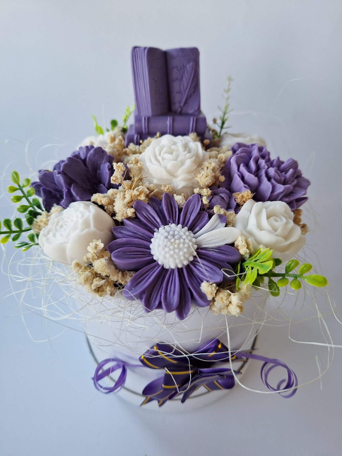 🌸 Материали: Ръчно Изработени Ароматни Сапунени Цветя, сапунена книга, сухи акценти, изкуствена зеленина, декоративна кутия с панделка