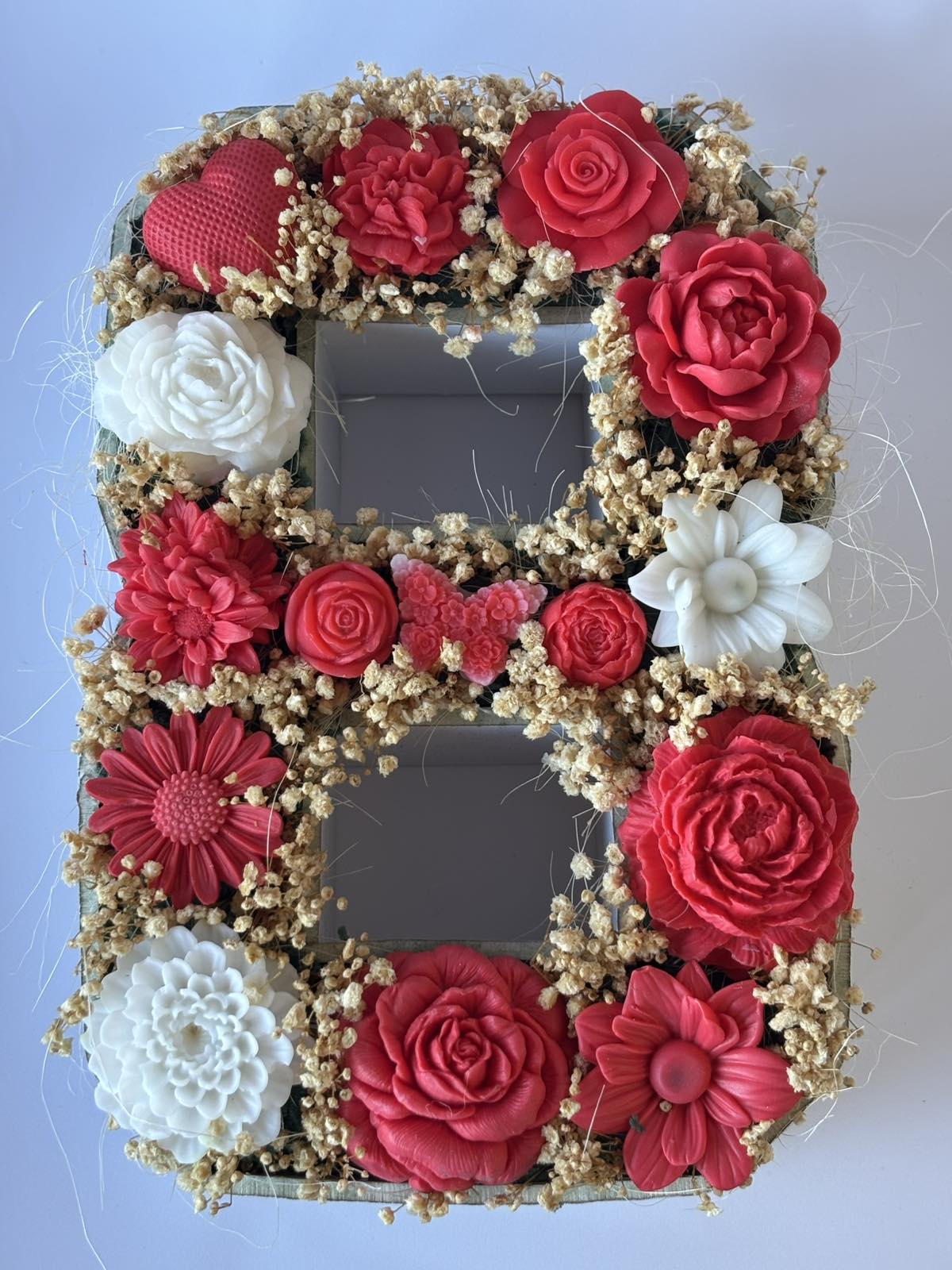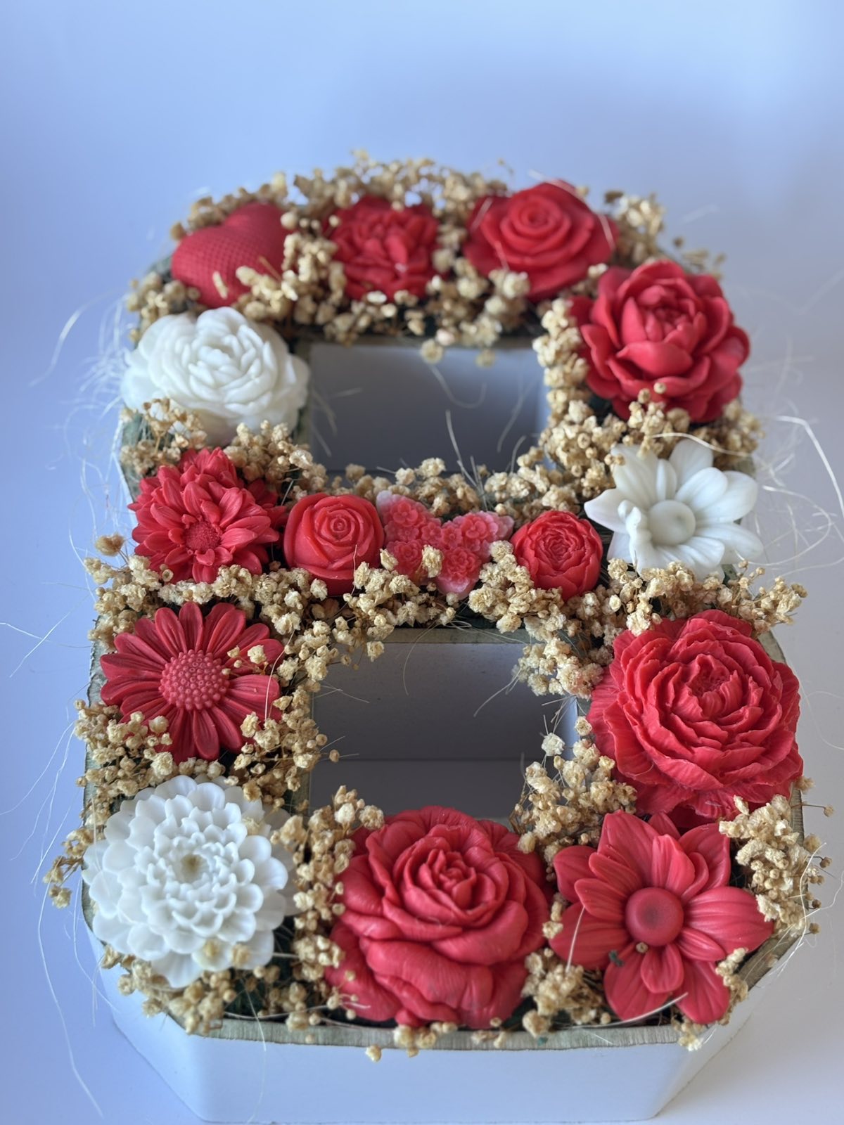 🌸 Материали: Ръчно изработени ароматни сапунени цветя в червено и бяло, сухи цветя и декоративни елементи 🌿