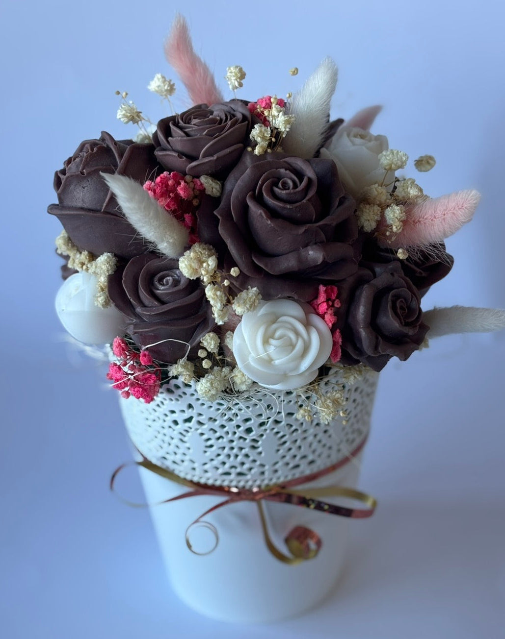 🌹 Материали:Ръчно изработени Ароматни Сапунени рози в кафяво и бяло, сухи натурални елементи и декоративни акценти, подбрани с внимание.