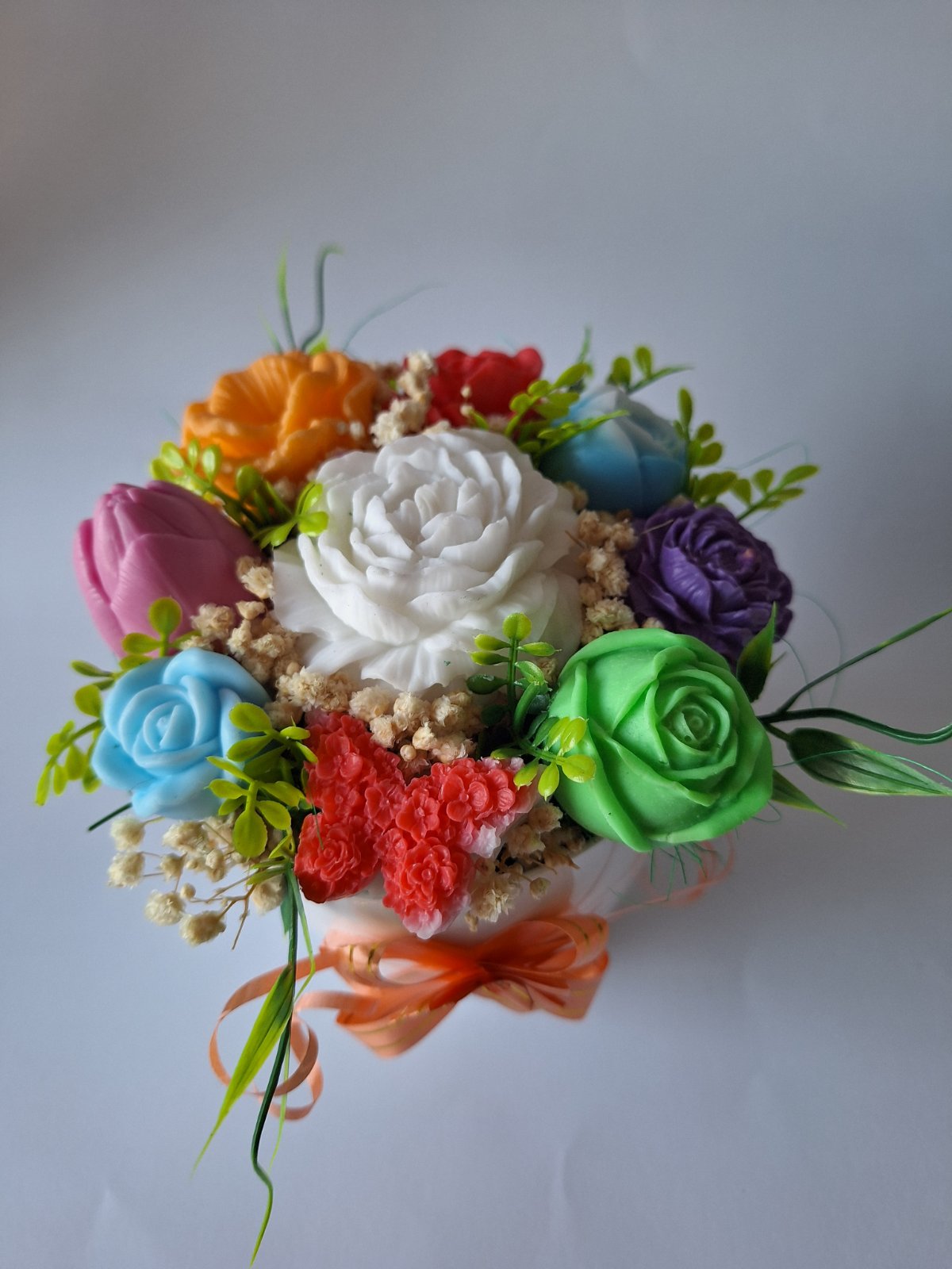 Този букет е като прошепнато "обичам те" в пролетен ден. Централната снежнобяла роза носи усещане за чистота и нежност, заобиколена от феерия от пастелни и по-наситени цветове – виолетово, кайсиево, коралово и розово. Цветята са ръчно изваяни от ароматен сапун, а композицията е завършена с флорална пеперуда и нежна зеленина за още повече магия. Поставен в изчистена елегантна бяла саксия, "Цвят от Облаци" е подарък, който не избледнява – нито като цвят, нито като емоция.