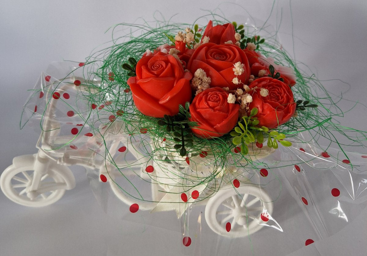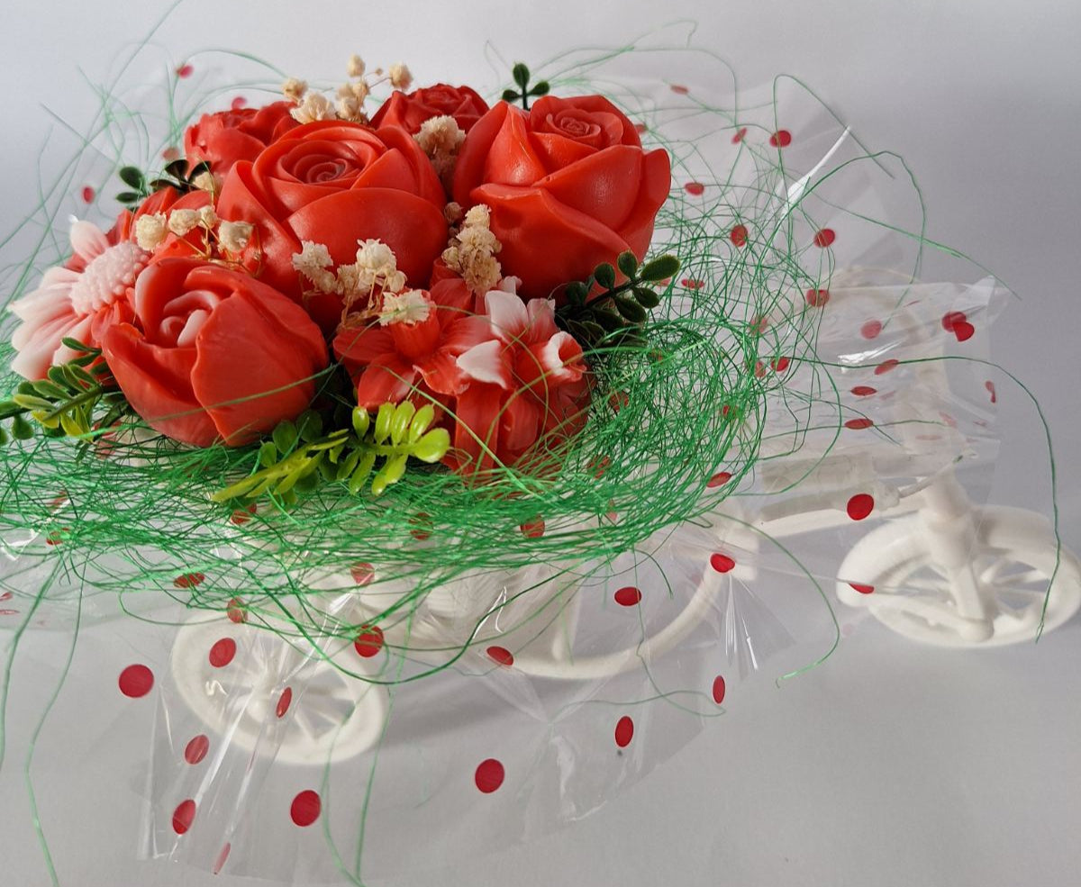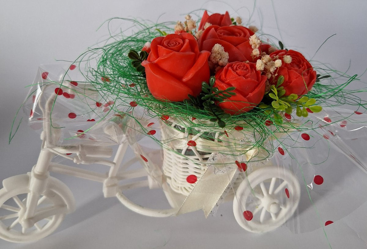Букет🚲💖„Цветна Разходка в червено"🚲💖 Ръчно Изработени Ароматни Сапунени Цветя в саксия с триколка