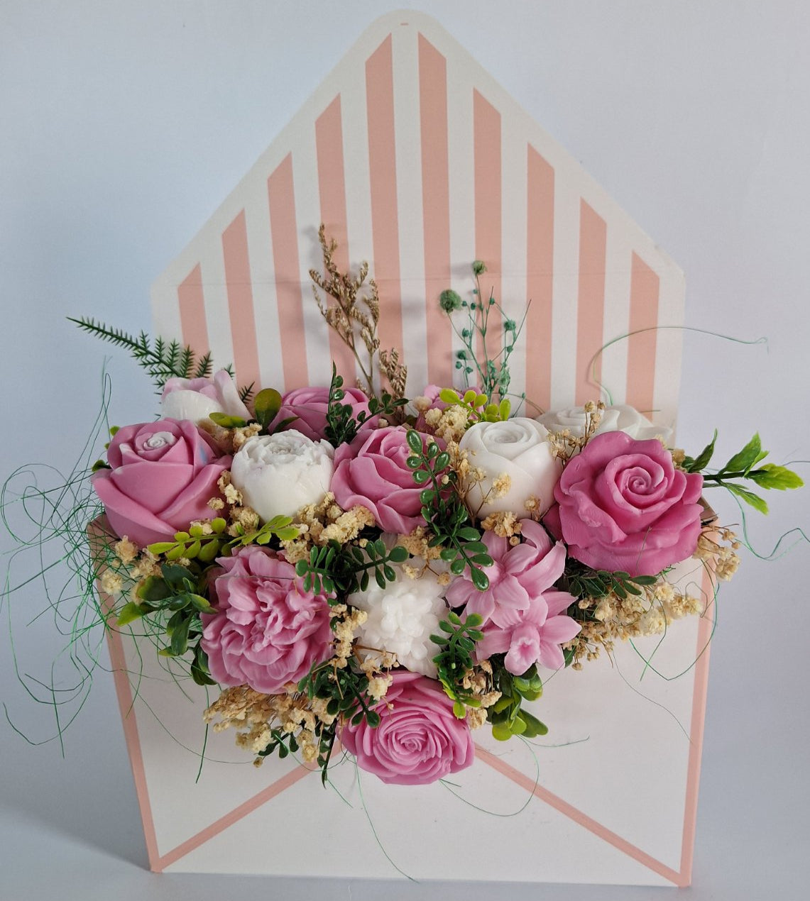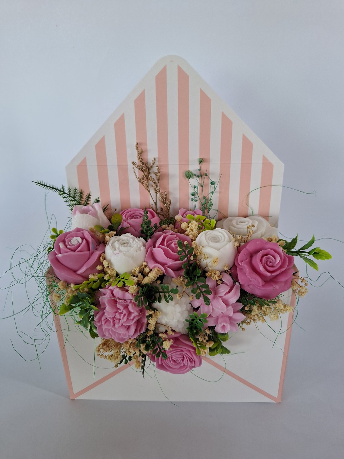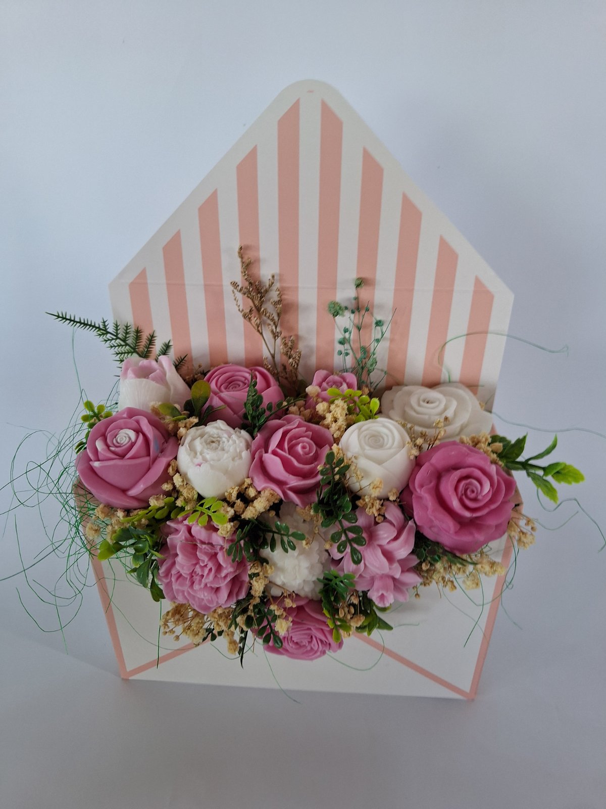 💗 Класическа комбинация от розово, бяло и крем – сапунени цветя, които носят мекота, нежност и вълшебство. Поставени в изискана кутия-плик с деликатни райета, създаваща усещане за винтидж романтика.