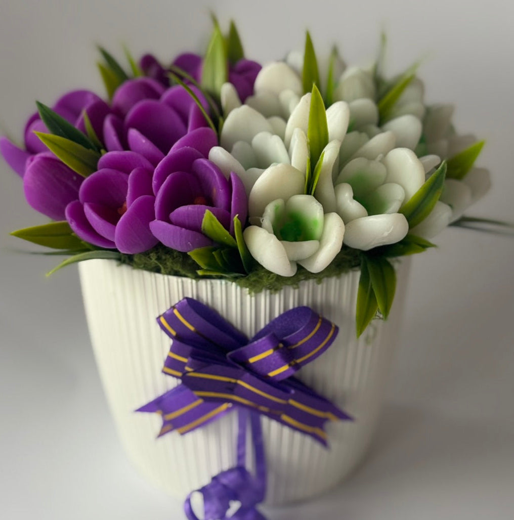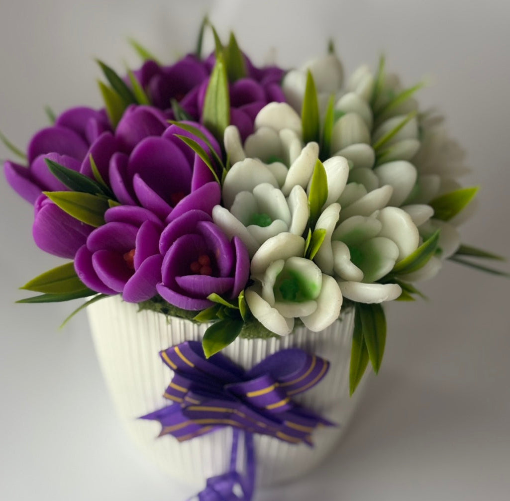 🌹 Материали: Ръчно изработени ароматни сапунени цветя – кокичета и минзухари в бяло и лилаво, зелени декоративни елементи и натурални акценти.