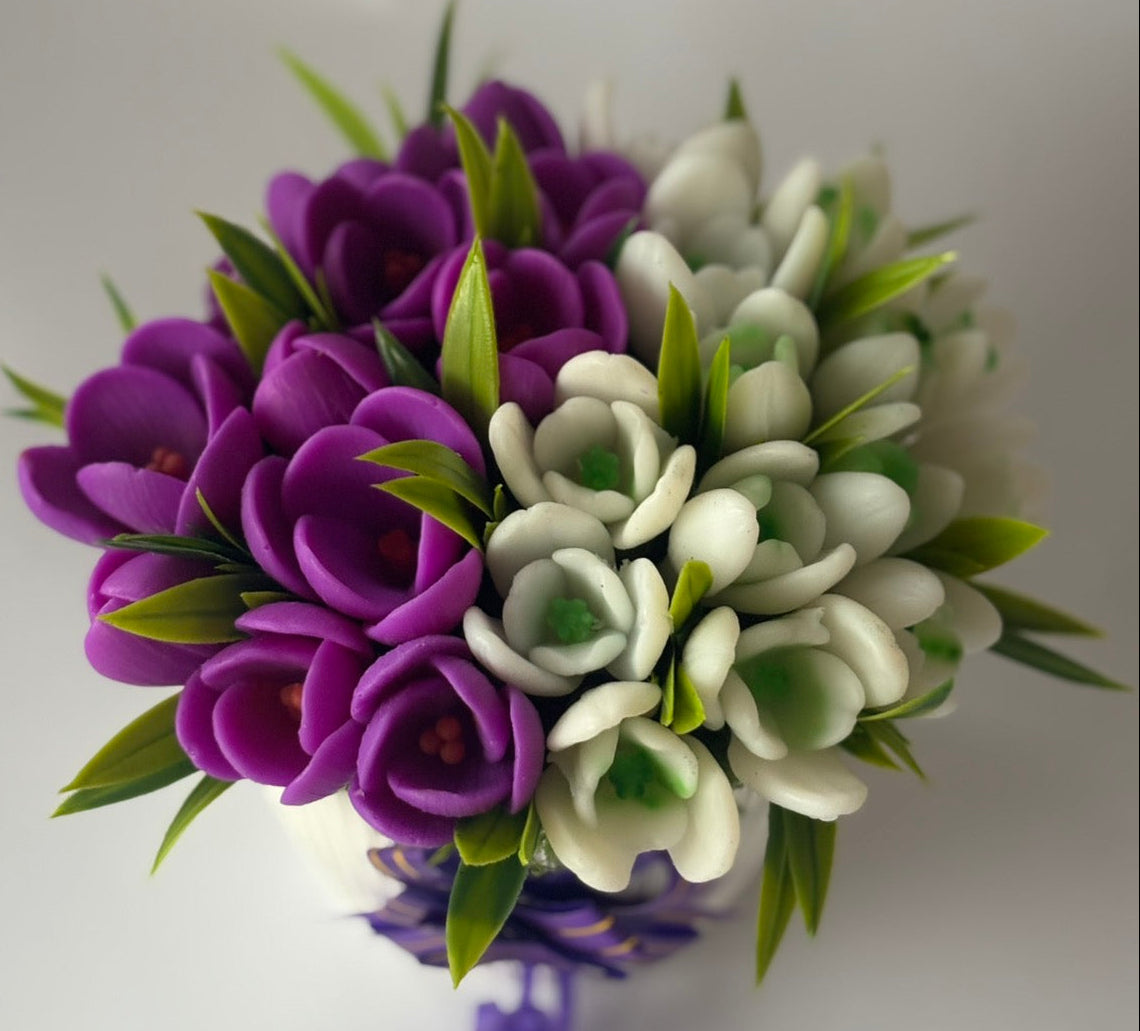 Букет🤍💜„Кокичета и Минзухари“ – Ръчно Изработени Ароматни Сапунени Цветя🤍💜