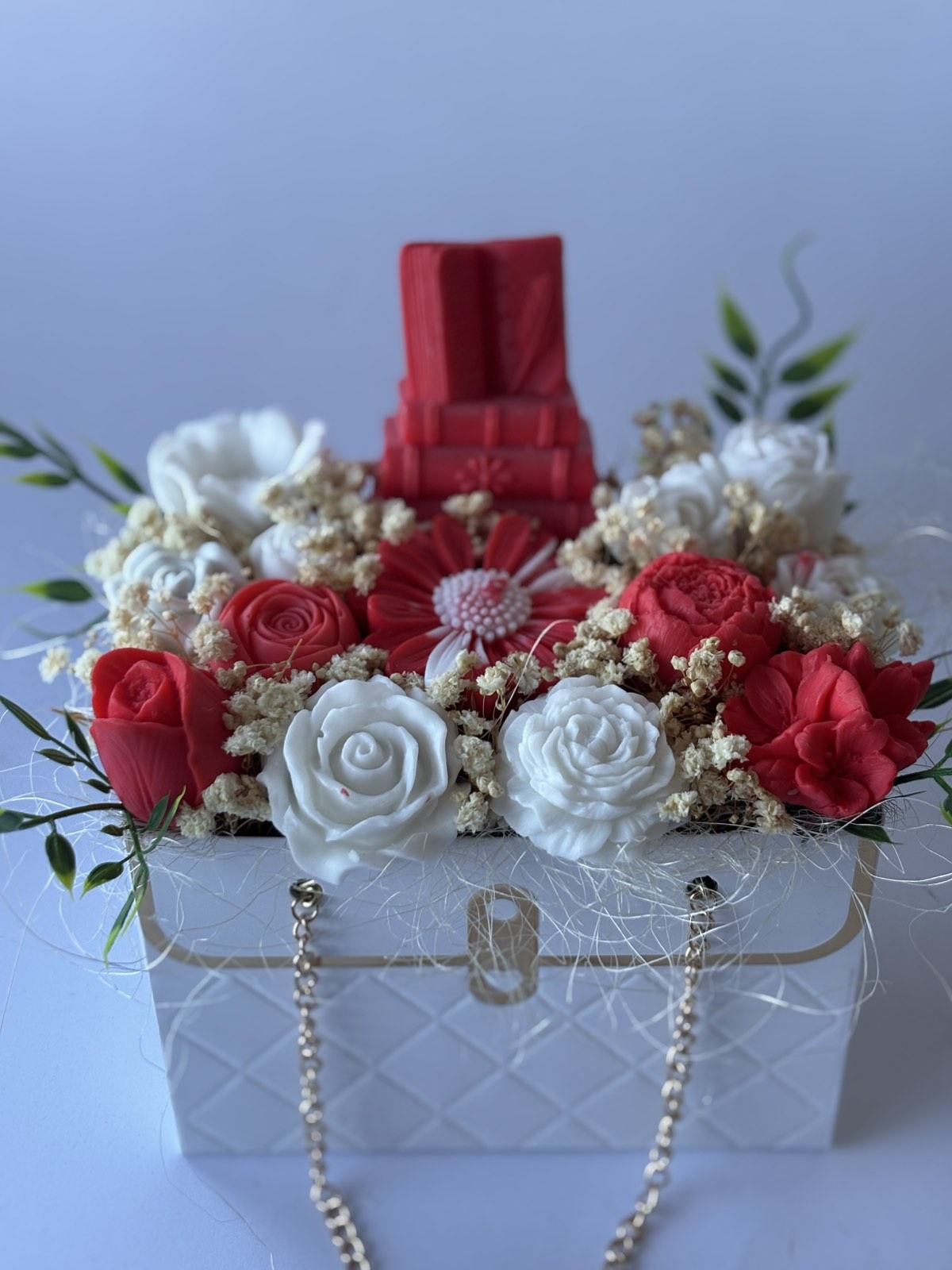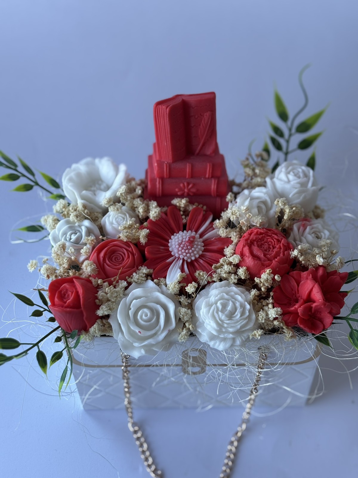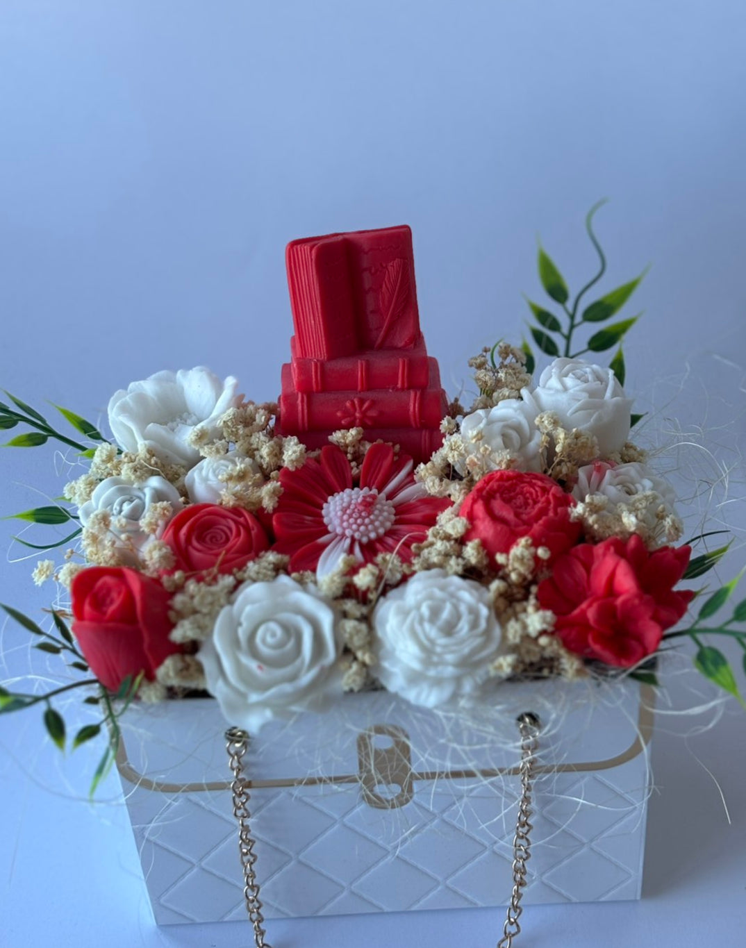 🌸 Материали: Ръчно изработени ароматни сапунени цветя, сухи акценти, изкуствена зеленина, декоративна чантичка с верижка