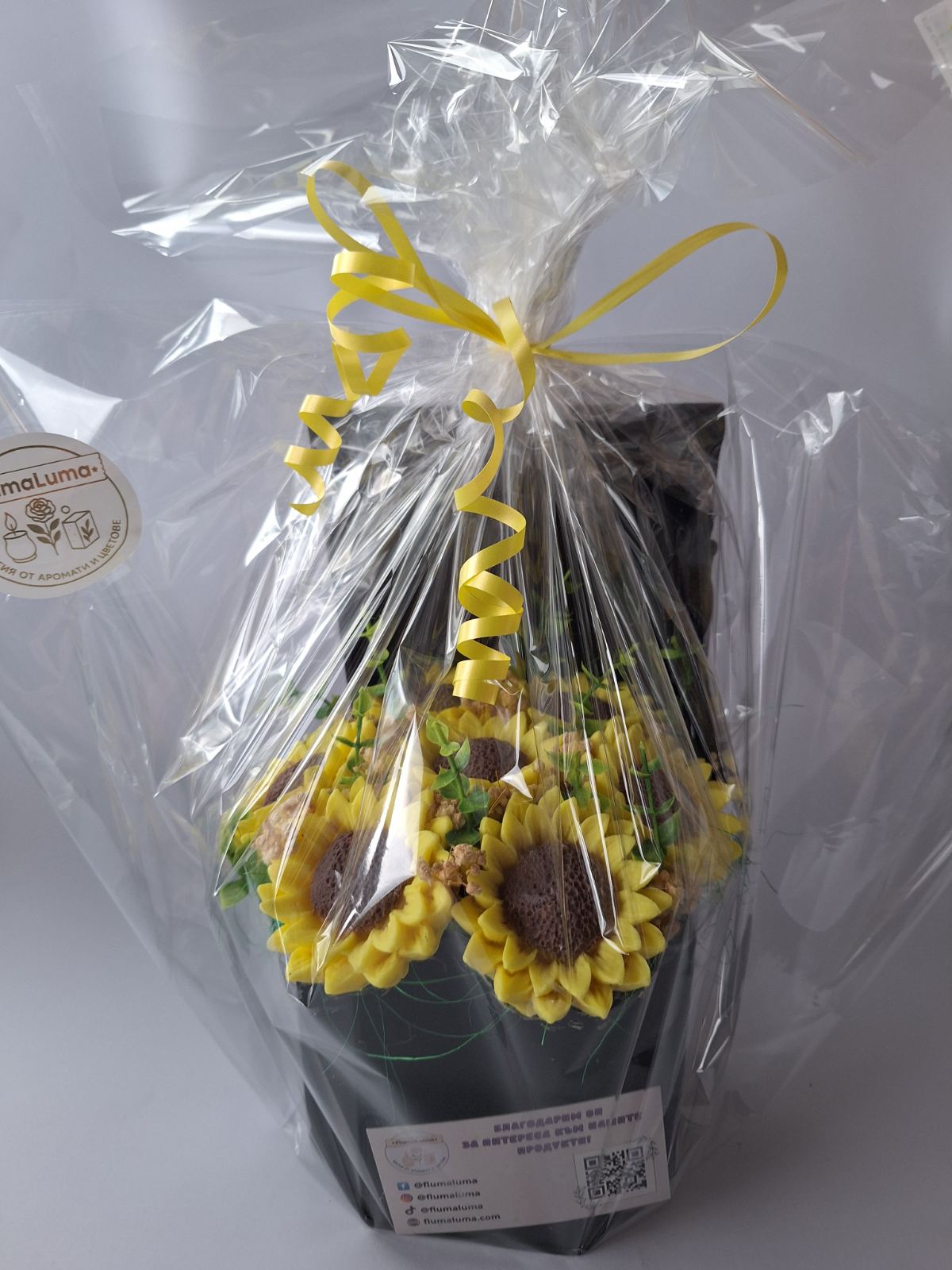 🌸 Материали: Ароматни сапунени цветя (слънчогледи), сухи акценти, изкуствена зеленина, специална кутия във форма на академична тога, текстилна панделка.