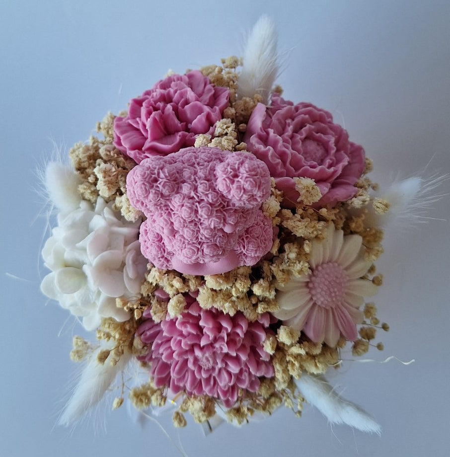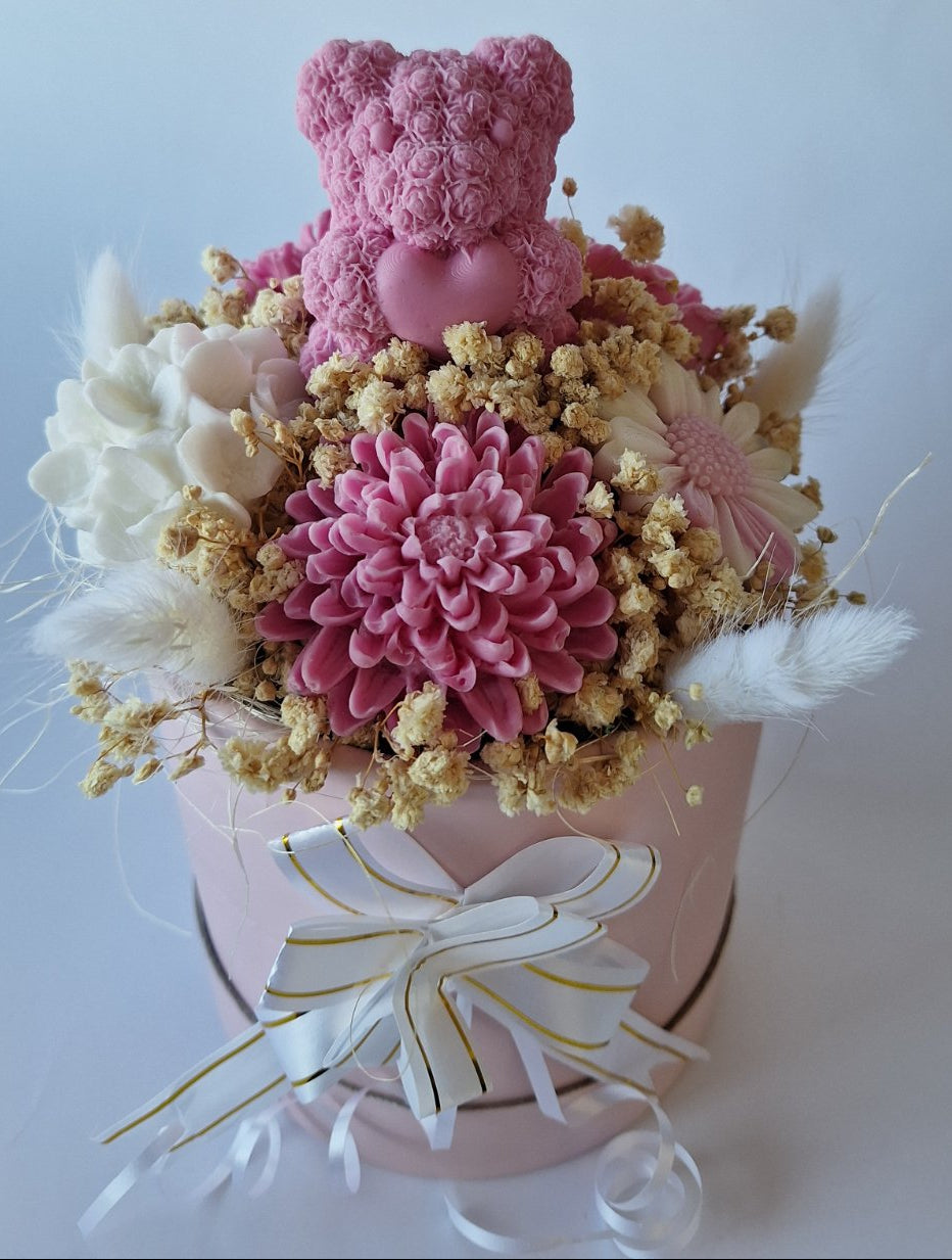 Малкото розово мече, изваяно от сапун и гушнало сърце, стои като пазител на любовта сред разцъфнали цветя и пухкави сухи акценти. Всяко листенце и венчелистче носи усещане за топлина, чистота и грижа.