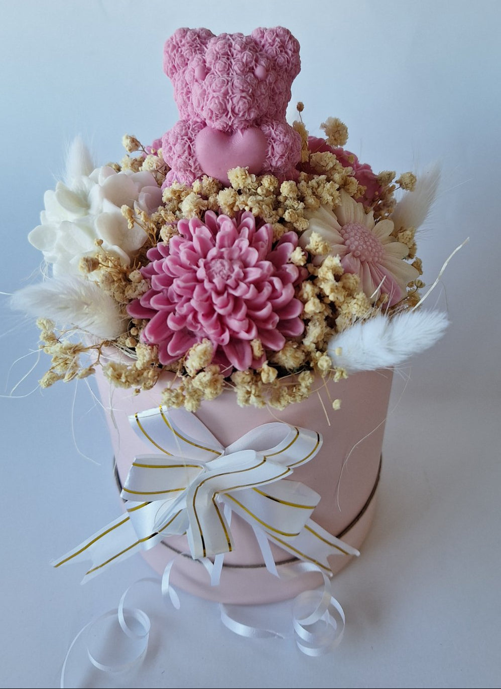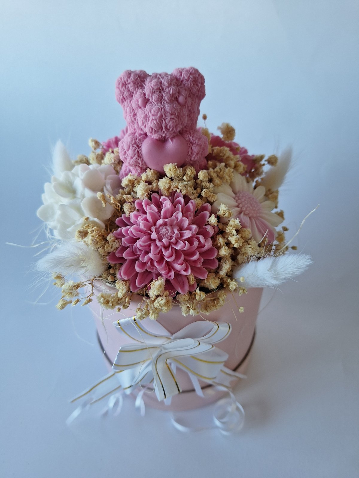 🌸 Материали: Ръчно Изработени Ароматни Сапунени Цветя, сапунено мече, сухи акценти, пухчета, декоративна кутия с панделка
