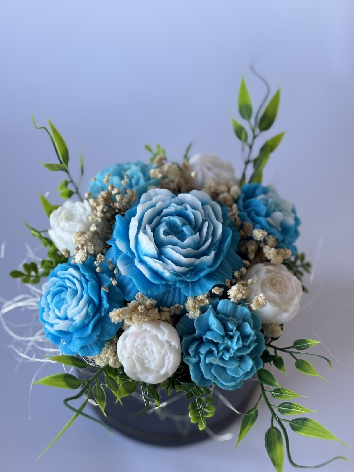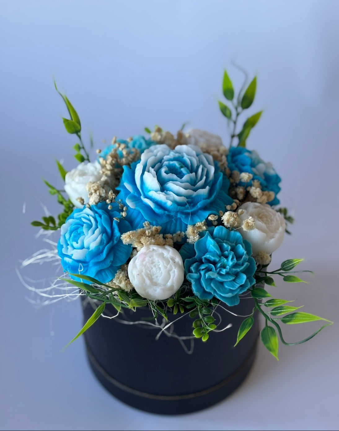 🌸 Материали: Ръчно изработени ароматни сапунени цветя в нюанси на синьо и бяло, сухи акценти и зеленина 🌿, поставени в елегантна черна кутия с панделка 🎀