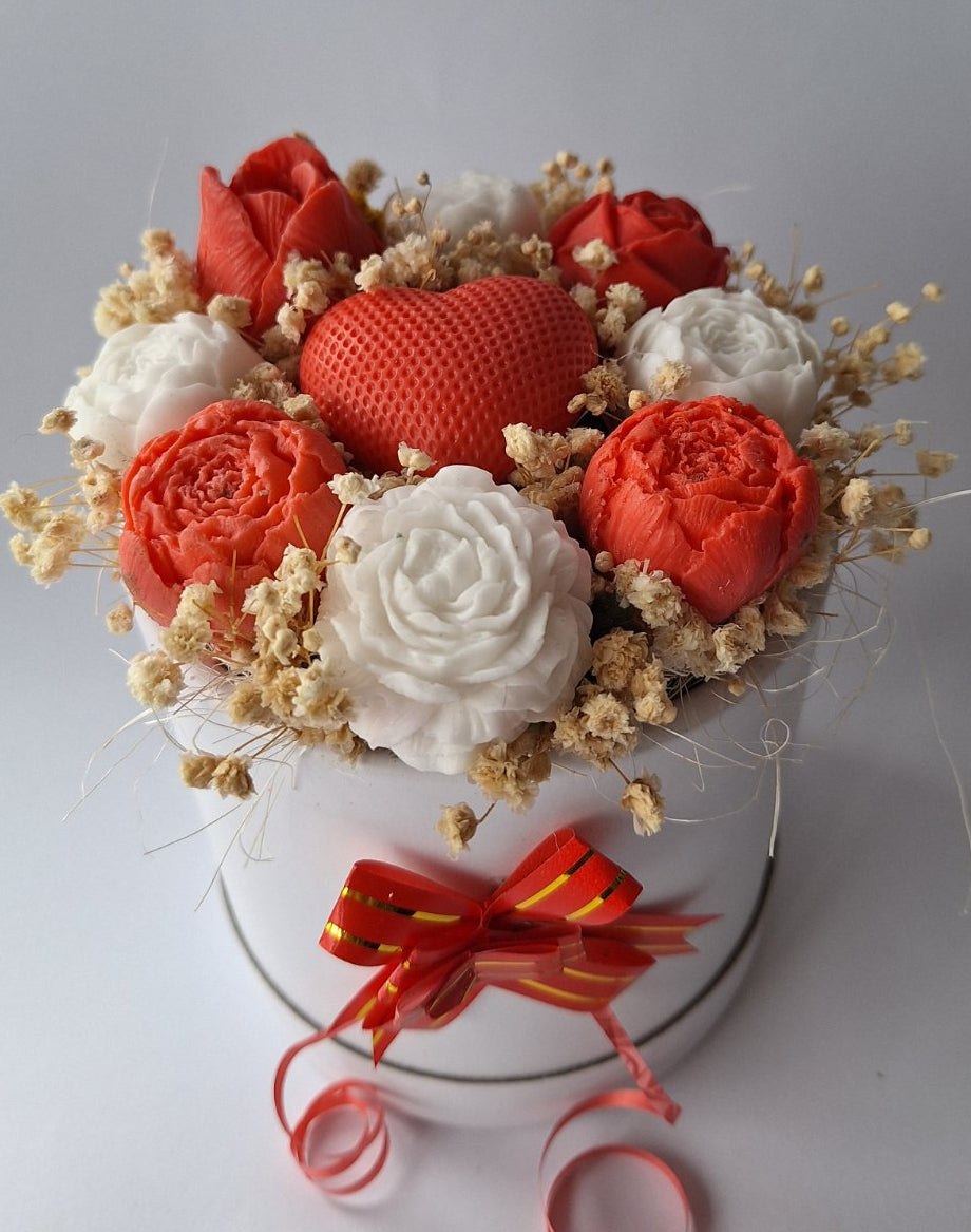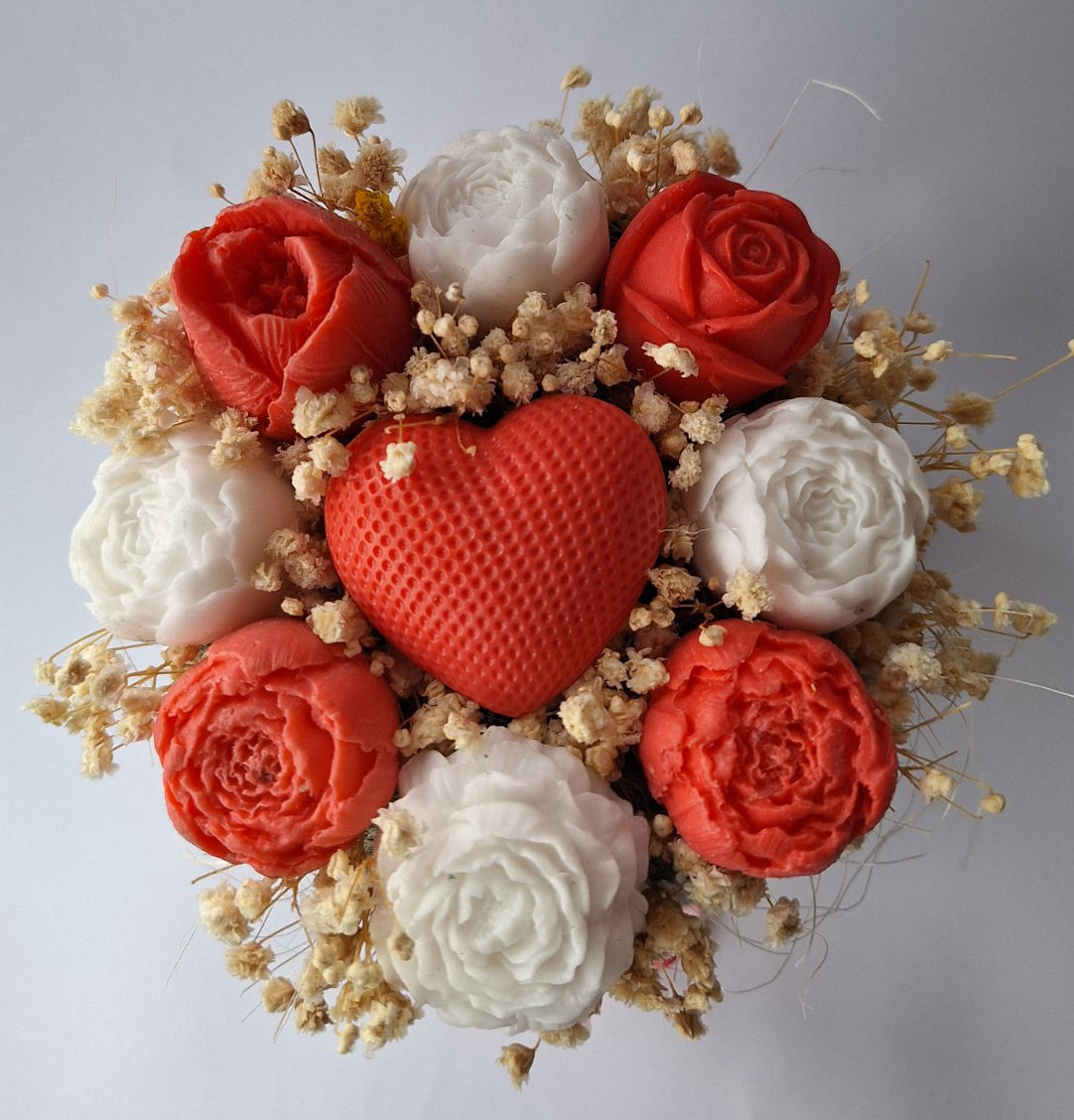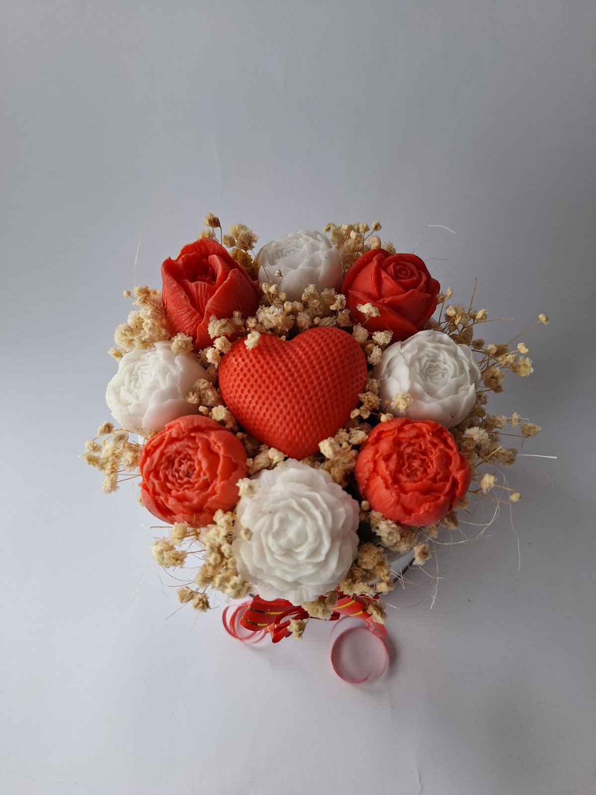 „Сърце от Любов“ е нежна и романтична композиция, в която червеното и бялото се преплитат като символ на страст и чистота. В центъра ѝ стои сърце от ароматен сапун — знак за обич, топлина и близост.
